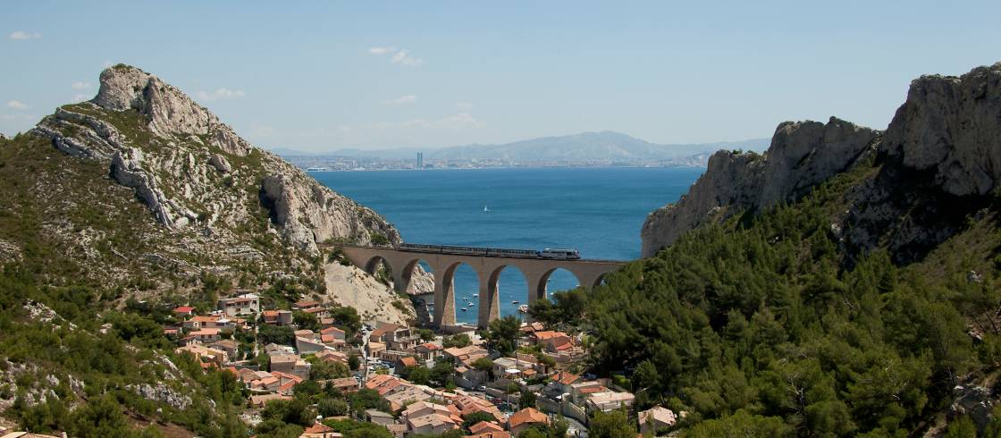 La ligne 7 du TER Marseille-Miramas longe la côte, accrochée au flanc du massif, et offre un point de vue remarquable sur nos calanques. Ayant fait l’objet de plusieurs reportages télévisés, cette promenade en train ravira les amoureux de la grande bleue ! Avec le Train de la Côte bleue, parcourez les 32 km de calanques de Marseille à Miramas. Pendant près de 1h15, viaducs et tunnels s'enchaînent de l'Estaque à la Couronne. Un parcours panoramique, au cœur des calanques protégées baignées d’eaux turquoises.